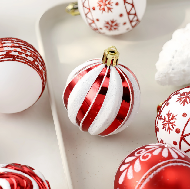 Rinkinį sudaro burbulai su snaigių ir dryžių raštais, kurie žavi savo subtiliu blizgesiu ir šventine harmonija. Baltos ir raudonos spalvos – klasikinis Kalėdų derinys, simbolizuojantis šilumą, džiaugsmą ir meilę.