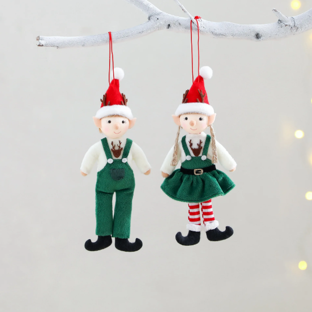 🧝♀️ Žaisminga elfiukų pora – komplekte du elfai: mergaitė ir berniukas, pasipuošę šventiniais kostiumais.